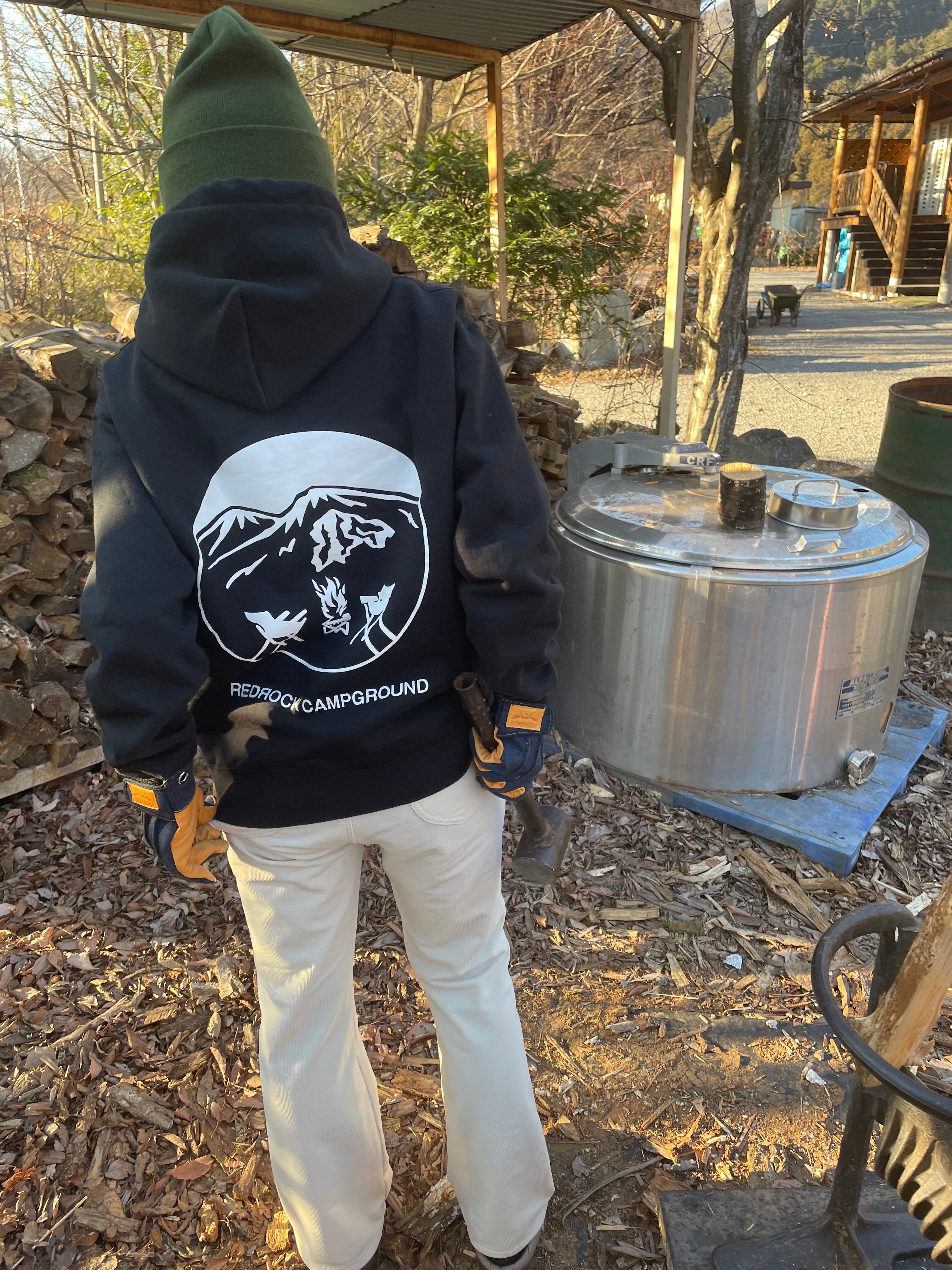 厚手で暖かい裏起毛のパーカーが登場しました!キャンプやアウトドアにぴったりの頼れる一枚です。特に寒い季節に欠かせないアイテムとして、厚手生地がしっかりとした防寒効果を発揮します。また、デザイン性もこだわっており、背中にはREDROCKキャンプ場の風景が描かれています。機能性とおしゃれさを両立させたアイテムです。