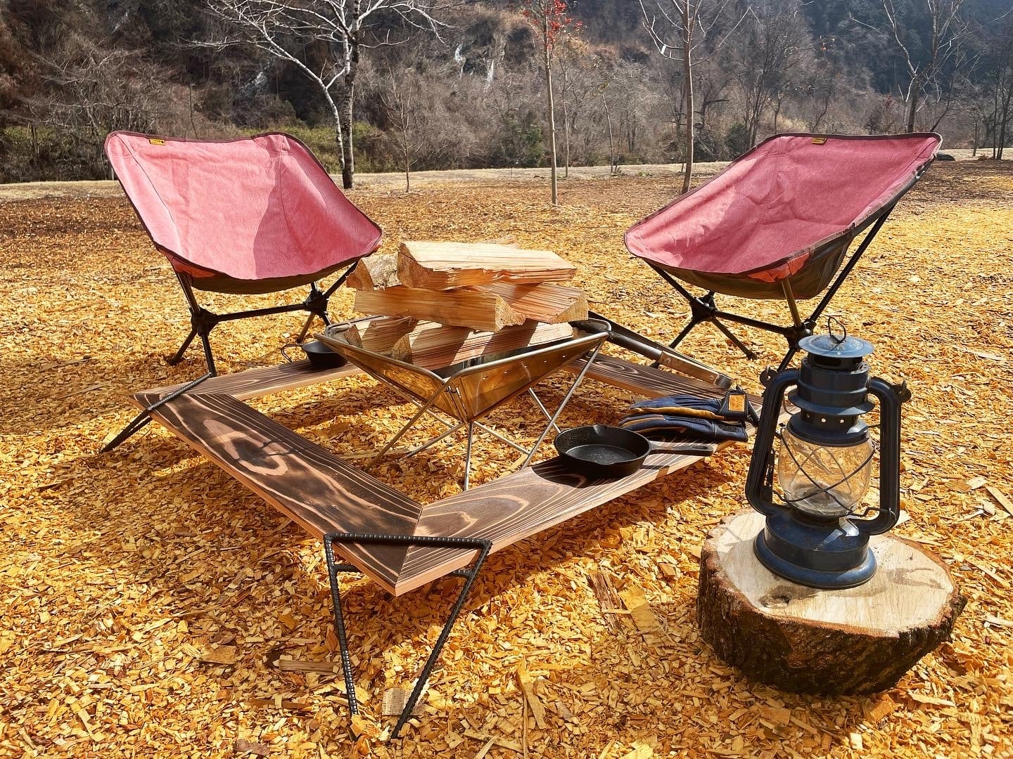 焚火台を囲んで設置できるローテーブル。